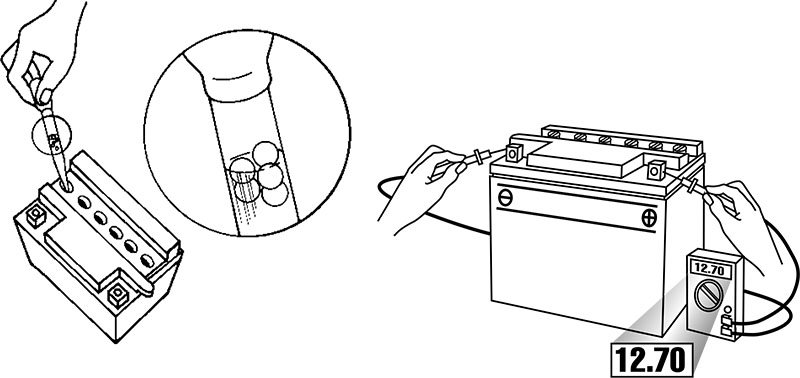 Check the charging status using a hydrometer or voltmeter. With a voltmeter, voltage readings appear instantly to show the charging status. Remember to connect the positive lead to the positive terminal and the negative lead to the negative terminal.