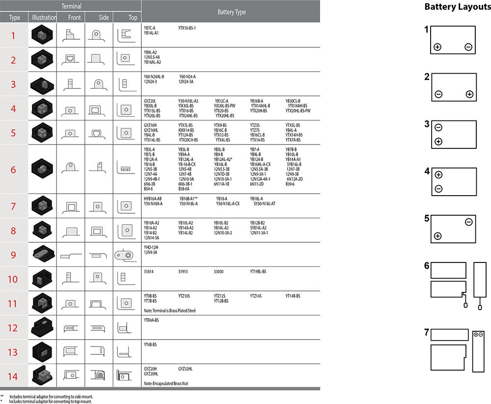 Batteries are manufactured using a range of terminals that vary in size and type. Please refer to the details shown below.